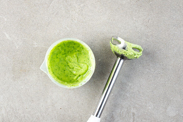 Den Knoblauch schälen, grob würfeln und mit dem Feta, dem Basilikum samt Stängeln, 1EL hellem Essig, 1–2EL Wasser sowie 1 Prise Pfeffer in einem hohen Gefäß zu einer glatten Creme pürieren. Nach Geschmack mit mehr Essig, Salz oder Pfeffer verfeinern.