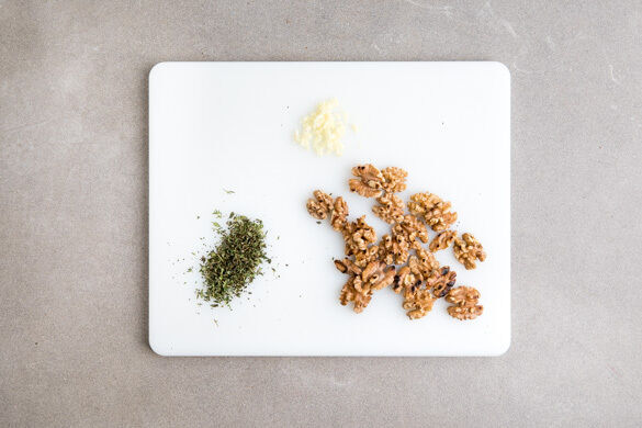 Die Walnüsse in einer großen Pfanne ohne Zugabe von Fett bei mittlerer Hitze 1–2Min. anrösten. Vorsicht, sie können schnell zu dunkel werden. Zum Abkühlen aus der Pfanne nehmen und beiseitestellen. Den Knoblauch schälen und fein würfeln. Die Thymianblättchen abstreifen und ggf. grob hacken.