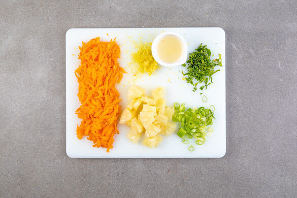 Die Karotten ggf. schälen und grob raspeln. Die Lauchzwiebel in feine Ringe schneiden. Den Koriander samt Stängeln fein schneiden. Die Zitronenschale abreiben, dann die Zitrone halbieren und auspressen. Ca. ¾ der Ananas in ein Sieb abgießen, dabei ca. die ½ des Safts auffangen, und ggf. klein schneiden. Tipp: Wer mag, kann auch mehr Ananas verwenden.