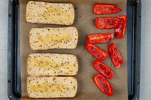 Die Paprika vierteln, entkernen und mit 1TL Olivenöl und 1 kräftigen Prise Salz vermengen. Auf einem mit Backpapier ausgelegten Backblech ca. 15Min. im Ofen rösten, dann herausnehmen. Die Brötchen aufschneiden und die Schnittflächen mit je ½TL Olivenöl bestreichen und mit 1 Prise Salz bestreuen. Die Brötchen auf dem Blech oder dem Ofenrost 3–4Min. mitrösten.