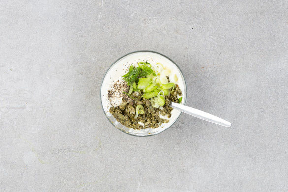Den Joghurt mit 6EL Mayonnaise und 3EL Senf verrühren. Die Lauchzwiebeln in feine Ringe schneiden. Die Kapern fein hacken. Ca. ⅔ der Lauchzwiebeln und die Kapern unterrühren und die Remoulade mit Salz und Pfeffer abschmecken. Vorsicht, die Kapern sind salzig, daher zunächst sparsam würzen und nach Bedarf nachwürzen.