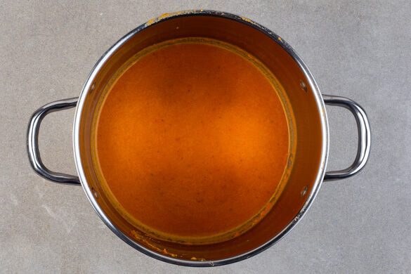 Den Stabmixer abspülen und die Suppe cremig pürieren. Ggf. etwas Wasser hinzufügen, falls die Suppe zu dickflüssig ist. Die Suppe auf tiefe Teller oder Schalen verteilen und das Topping darüberträufeln. Mit den restlichen Tomaten sowie dem restlichen Koriander garnieren und servieren. Die Limettenspalten und die Tortillachips dazu reichen.