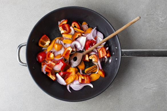 Die Zwiebeln, die Paprika und die Karotten in derselben Pfanne mit 1–2EL Pflanzenöl und 1–2 Prisen Zimt bei starker Hitze 2–3Min. scharf anbraten. Tipp: Wer keinen Zimt mag, lässt ihn einfach weg.