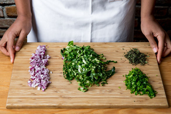 Die Zwiebeln schälen, halbieren und fein würfeln. Den Spinat in grobe Streifen schneiden. Die Oreganoblätter abzupfen und fein hacken. Die Petersilie samt Stängeln fein hacken. Die Zitronenschale abreiben, dann die Zitrone halbieren und auspressen. 1–2EL Zitronensaft, 1–2EL Olivenöl, 1EL Essig sowie Salz und Pfeffer zu einem Dressing verrühren.