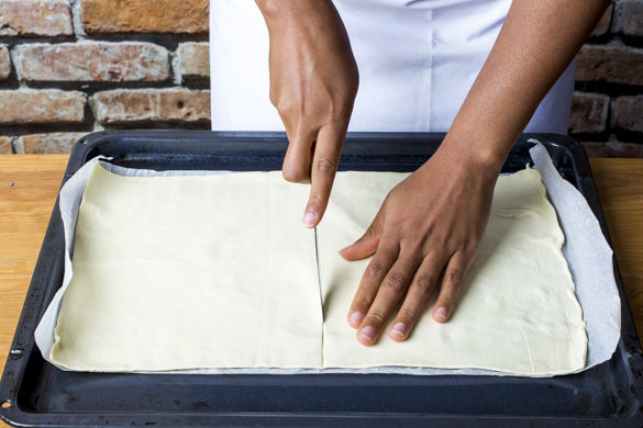 Die Blätterteige mit dem Papier nach unten auf zwei Backblechen ausrollen und jeweils mit einem Messer halbieren.