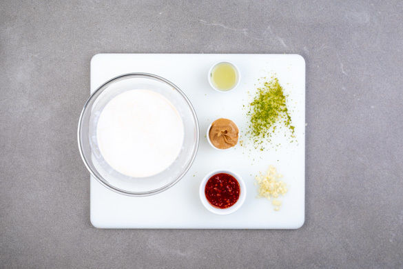 Den Knoblauch schälen und fein würfeln. Die Limettenschale abreiben, dann die Limette halbieren und auspressen. Den Knoblauch mit der Kokosmilch, 1TL Limettenabrieb, Limettensaft nach Geschmack, der 1/2 der Sweet-Chili-Sauce, der 1/2 der Sojasauce und der Erdnussbutter verrühren.