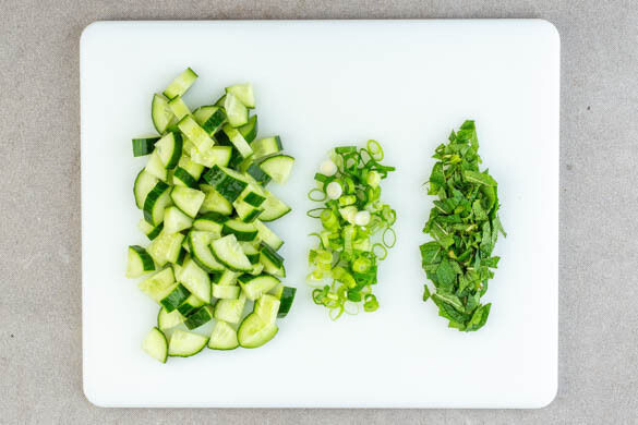 Die Gurke längs vierteln und grob würfeln. Die Lauchzwiebeln in feine Ringe schneiden. Die Minzeblätter von den Stängeln zupfen und grob schneiden.
