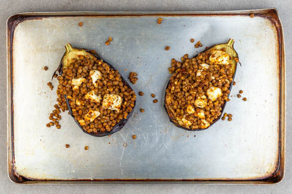Das Auberginenfleisch mit einer Gabel zerdrücken, die Linsen-Feta-Füllung auf die Auberginen verteilen und ca. 5Min. im Ofen knusprig und goldbraun backen.