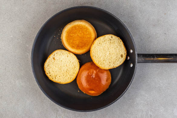 Die Brötchen halbieren und in einer großen Pfanne bei mittlerer Hitze auf jeder Seite in ca. 2Min. goldbraun anrösten. Die Brötchen aus der Pfanne nehmen, die Pfanne aufbewahren.