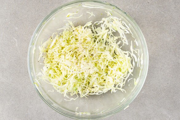 2EL vegane Mayonnaise, 1EL Essig, die Gewürzmischung und 1 Prise Salz verrühren. Den Weißkohl gründlich mit dem Würzdressing vermengen, ggf. leicht durchkneten. Mit Salz und Pfeffer abschmecken.