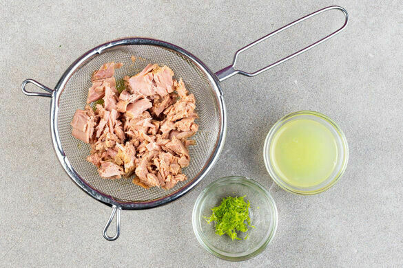 Die Limettenschale abreiben, dann die Limette halbieren und auspressen. Den Thunfisch in einem Sieb abtropfen lassen.