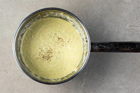 Die Lauchstreifen in einem kleinen Topf mit 2EL Olivenöl bei mittlerer Hitze ca. 2Min. anschwitzen. Den Thunfisch, den Knoblauch und 4EL Wasser unterrühren und 2–3Min. mitköcheln. Wenn der Lauch weich ist, die Crème fraîche unterrühren und alles mit einem Stabmixer pürieren. Mit der Limettenschale, dem Limettensaft sowie Salz und Pfeffer abschmecken.