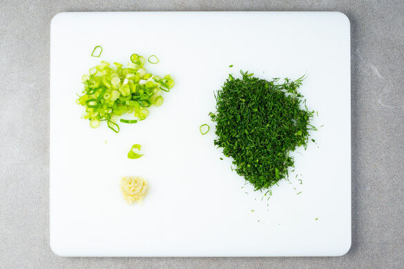 Die Lauchzwiebel in feine Ringe schneiden. 1 Knoblauchzehe schälen und fein würfeln. Den Dill samt Stängeln fein schneiden.