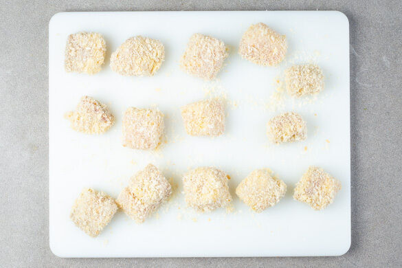 Den Fisch kalt abspülen, trocken tupfen und in ca. 3cm große Stücke schneiden, dabei evtl. vorhandene Gräten mit einer Pinzette entfernen. Mit Salz und Pfeffer würzen. Auf einem tiefen Teller 1 Ei verquirlen. Die Fischstücke nacheinander in 2EL Mehl wenden, dann durch das Ei ziehen und anschließend in der ½ des Panko-Paniermehls wenden.