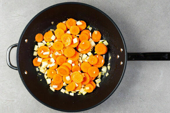 Die Karotten ggf. schälen, in dünne Scheiben schneiden und in einer großen Pfanne mit 3EL Pflanzenöl bei mittlerer bis starker Hitze ca. 2Min. anbraten. Die Zwiebel schälen, halbieren und grob würfeln. Den Knoblauch schälen und ebenfalls grob würfeln. Die Zwiebeln und den Knoblauch zu den Karotten geben, mit 1 Prise Salz würzen und ca. 3Min. mitbraten.