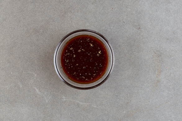 Die Sojasauce, die Teriyakisauce, die Maisstärke, 100ml Wasser, 1 kräftige Prise Pfeffer und 1 Prise Salz zu einer Würzsauce verrühren. Den Knoblauch schälen und durch eine Knoblauchpresse drücken, dann mit der Würzsauce vermengen.