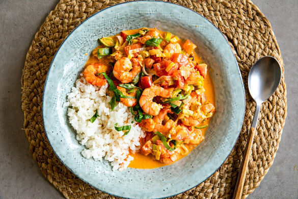 Zeit für ein cremiges Curry! Zarter Lauch, fruchtige Tomaten, zitronig-würziger Ingwer und aromatisches Thai-Basilikum machen aus diesem asiatischen Gericht eine echte Gaumenfreude. Feine Garnelen liefern eine Extraportion Eiweiß und die gelbe Currypaste heizt uns ordentlich ein. Und dann ist es auch noch ruckzuck fertig! Was will man mehr?