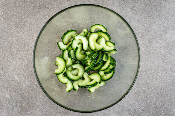 In einem mittelgroßen Topf 600ml leicht gesalzenes Wasser zum Kochen bringen. Das Sesamöl mit 2TL Honig, 2EL hellem Essig und ½TL Salz zu einem Dressing verrühren. Die Gurke längs halbieren und die Kerne mit einem Löffel auskratzen, dann in dünne Scheiben schneiden und mit dem Dressing vermengen. Ggf. mit mehr Salz und Essig abschmecken.