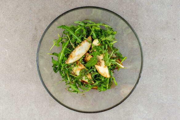 Die Birnen halbieren, entkernen und in dünne Scheiben schneiden. Aus der restlichen Hoisinsauce, 1EL Mayonnaise und 2EL hellem Essig ein Dressing anrühren und vorsichtig mit dem Rucola und der ½ des Sesams vermengen.