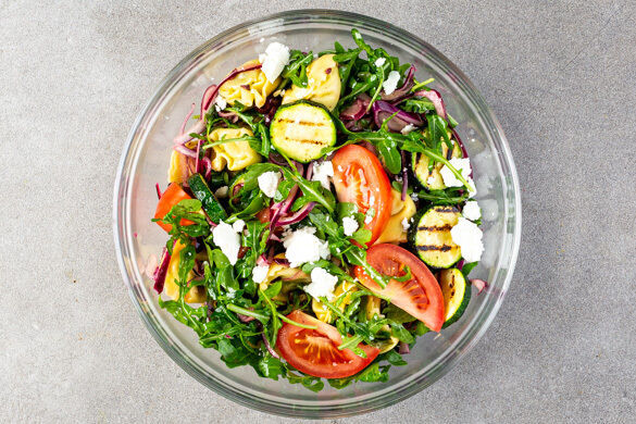 Hach, gefüllte Pasta ... da ist jeder Bissen ein Glücksmoment! Heute sind Schmackofatzos mit Ricotta und Spinat gefüllt und passen somit einwandfrei zu ihren mediterranen Kumpanen: frischem Feta und aromatischen Oliven, die diesen sättigenden Salat in einen echten Mittelmeerurlaub verwandeln. Auch lecker gegrillte Zucchini, nussiger Rucola und ein erfrischendes Zitronendressing bringen uns dem Süden ein ganzes Stück näher!