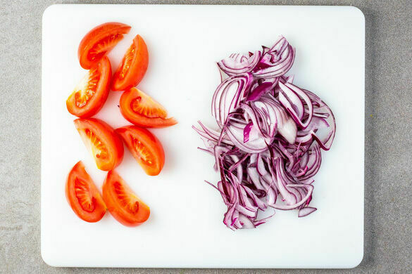 Die Tomaten achteln. Die Zwiebel schälen, halbieren und in sehr feine Streifen schneiden.
