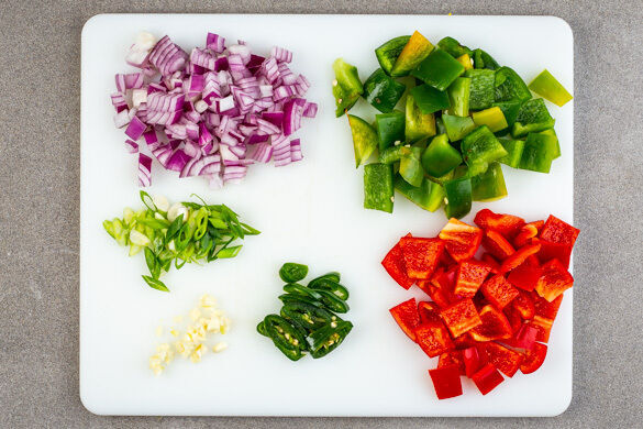 Die Paprika separat vierteln, entkernen und in ca. 2cm große Stücke schneiden. Die Lauchzwiebel in dünne Ringe schneiden. Die Chilischote in feine Ringe schneiden. Tipp: Für weniger Schärfe die Kerne entfernen. Die Zwiebel und den Knoblauch schälen und grob würfeln.