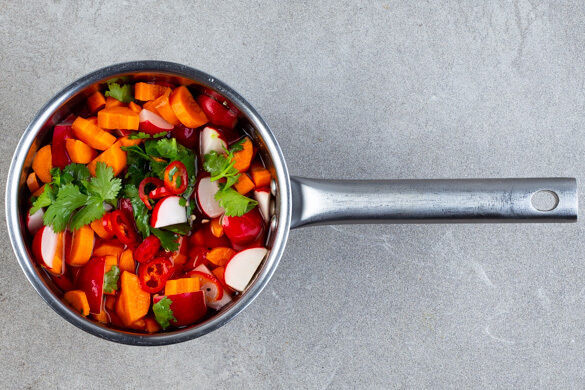 In einem zweiten kleinen Topf 75ml Wasser mit 75ml hellem Essig, 3EL Zucker, ½TL Salz und 1 Prise Pfeffer verrühren und zum Kochen bringen. Den Topf vom Herd nehmen, sobald sich der Zucker aufgelöst hat, und die Karotten, die Radieschen, die ½ des Korianders und die ½ der Peperoni oder mehr nach Geschmack untermengen und beiseitestellen.