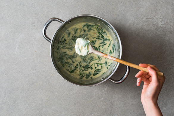Den Spinat gründlich waschen, in die Sauce geben und 2–3Min. mitkochen, bis er zusammengefallen ist.