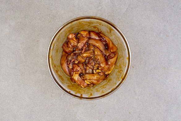 Das Fleisch mit etwas Küchenkrepp trocken tupfen und quer zur Faser in ca. 1cm breite Streifen schneiden. Mit der Teriyakisauce und dem Currypulver vermengen und beiseitestellen.
