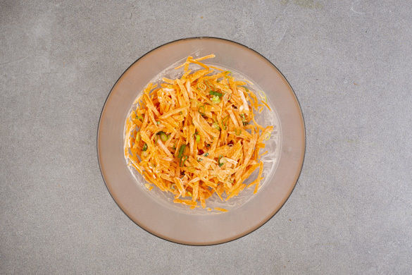 Die Karotten und die 1/2 der Lauchzwiebeln mit der Mayonnaise vermengen und mit Salz und Pfeffer würzen.