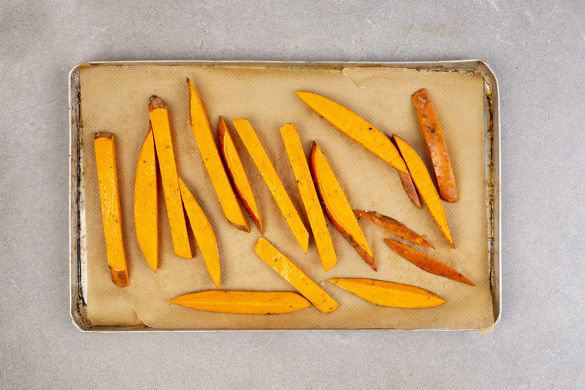 Den Backofen auf 210°C Umluft (230°C Ober-/Unterhitze) vorheizen. Die Süßkartoffel samt Schale in pommesartige Stifte schneiden und auf einem mit Backblech ausgelegten Backblech mit 1EL Olivenöl sowie Salz und Pfeffer vermengen, dann 20Min. im Ofen goldbraun backen.