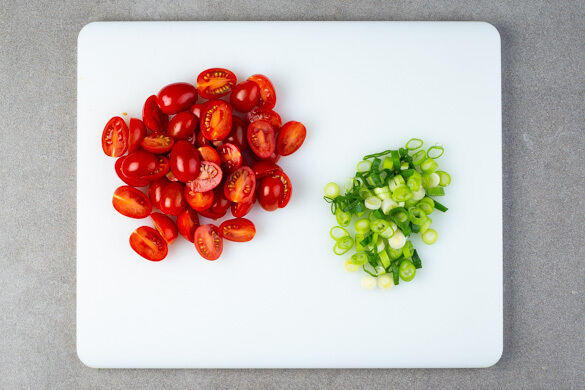 Die Kirschtomaten halbieren. Die Lauchzwiebel in dünne Ringe schneiden.