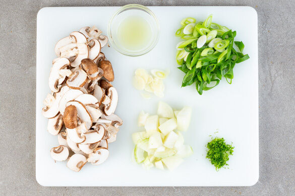 In einem großen Topf ausreichend gesalzenes Wasser für die Nudeln zum Kochen bringen. Die Pilze ggf. säubern und in dünne Scheiben schneiden. Die Lauchzwiebeln schräg in dünne Ringe schneiden. Die Zwiebel schälen, halbieren und grob würfeln. Den Knoblauch schälen und in feine Scheibchen schneiden. Eine Limettenschale abreiben und die Limetten auspressen.