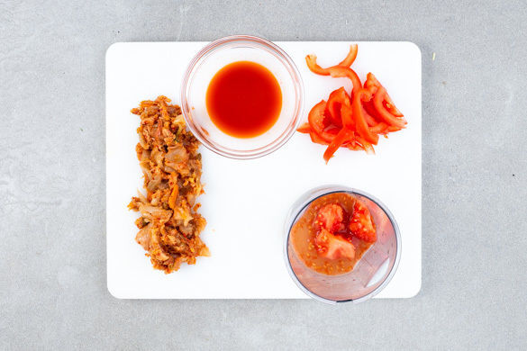 Das Kimchi in ein Sieb abgießen, dabei die Kimchiflüssigkeit auffangen. Das Kimchi in kleine Stücke schneiden. Die Tomaten halbieren. Die Kerne auslösen und in ein hohes Gefäß geben, das Fruchtfleisch in dünne Streifen schneiden.
