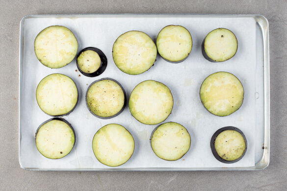Die Auberginen in ca. 1cm dicke Scheiben schneiden und auf einem mit Backpapier ausgelegten Backblech verteilen. Mit 2EL Olivenöl bepinseln, mit 1TL Salz sowie 1 kräftigen Prise Pfeffer würzen und 18–20Min. im Ofen backen, bis die Auberginen appetitlich gebräunt und gar sind.