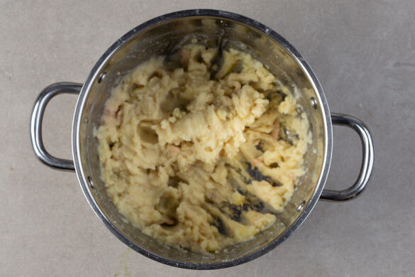 Den Backofen auf 240°C (220°C Umluft) vorheizen. In einem großen Topf ausreichend gesalzenes Wasser für die Kartoffeln zum Kochen bringen. Die Kartoffeln schälen und in ca. 2cm große Stücke schneiden. Den Knoblauch schälen. Sobald das Wasser kocht, die Kartoffeln mit den ganzen Knoblauchzehen in den Topf geben und in 10–12Min. gar kochen.