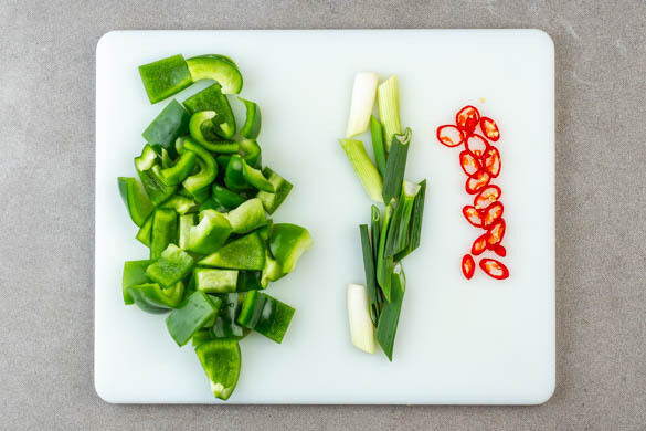 Während der Blumenkohl röstet, die Paprika vierteln, entkernen und in große Stücke schneiden. Die Lauchzwiebeln in je 6 lange Stücke schneiden. Die Peperoni in feine Ringe schneiden.