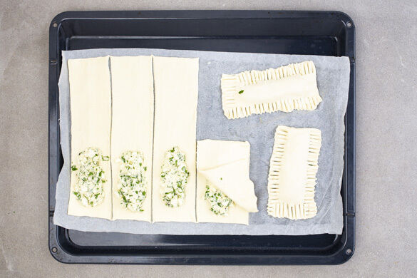 Den Teig mit dem Papier nach unten auf einem zweiten Backblech ausrollen und quer in 6 gleich große Streifen schneiden. Die Greekcreme gleichmäßig jeweils auf einer Hälfte der Streifen verstreichen und mit der anderen Teighälfte bedecken. Die Ränder gut mit einer Gabel verschließen.