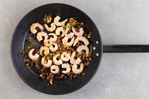 Den Knoblauch schälen und fein würfeln. Die Pistazien grob hacken. Die Garnelen in einem Sieb mit kaltem Wasser abspülen und mit etwas Küchenkrepp trocken tupfen. Die Pistazien in einer großen Pfanne mit 2EL Olivenöl bei starker Hitze ca. 2Min. anrösten, dann den Knoblauch und die Garnelen hinzufügen und weitere 2–3Min. braten, bis die Garnelen pink und gar sind.