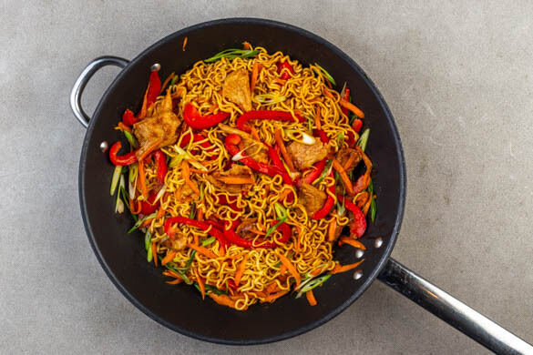 Die Nudeln in der Pfanne mit 2EL Pflanzenöl bei mittlerer Hitze 1–2Min. braten. Die Karotten, die Schnetzel und die Paprika untermengen und alles 3–4Min. mitbraten. Dann mit der Sojasauce nach Geschmack ablöschen und die Lauchzwiebeln unterheben.