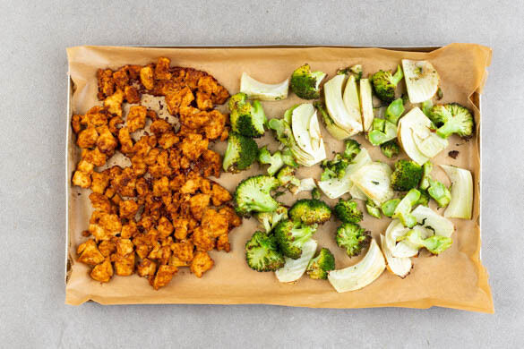 Den Backofen auf 240°C (220ºC Umluft) vorheizen. Den Brokkoli in mundgerechte Röschen zerkleinern und die Strünke in ca. 0,5cm dicke Scheiben schneiden. Die harten Stängel des Fenchels entfernen und ggf. vorhandenes Fenchelgrün für die Garnitur aufbewahren. 1 Fenchel längs halbieren und längs in ca. 2cm dicke Spalten schneiden.