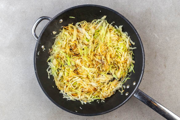 Die ½ des Kohls und den Knoblauch in einer großen Pfanne mit 4EL Olivenöl bei mittlerer Hitze unter gelegentlichem Rühren ca. 5Min. anbraten. Den restlichen Kohl in die Pfanne geben, ca. 15Min. mitbraten und kurz vor Ende der Bratzeit 1EL Olivenöl untermengen. Tipp: Falls nicht alles in eine Pfanne passt, einfach eine zweite Pfanne oder einen großen Topf verwenden.
