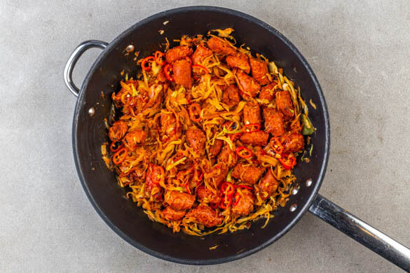Die Kohle vierteln, vom Strunk befreien und in feine Streifen schneiden. Tipp: Falls vorhanden, einen Gemüsehobel verwenden. Den Knoblauch schälen und grob würfeln. Die Peperoni in feine Ringe schneiden. Die vegane Chorizo in ca. 3cm große Stücke schneiden.