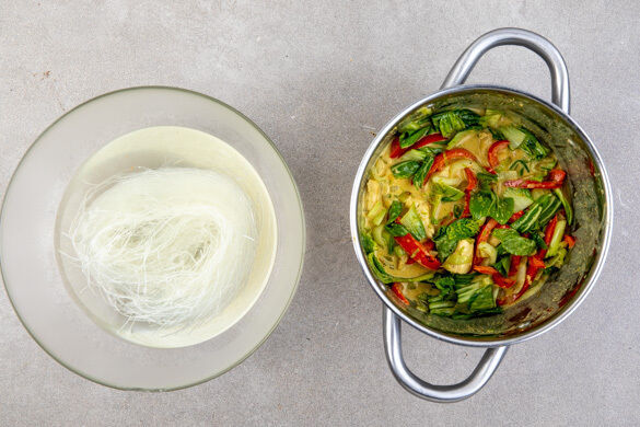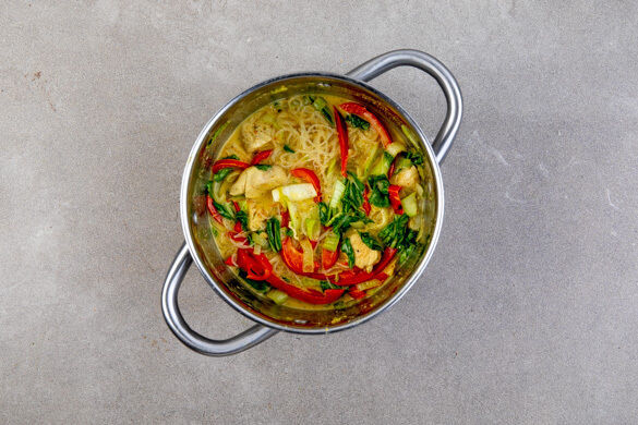 Die Paprika und die weißen Pak-Choi-Streifen mit der Knoblauch-Ingwer-Paste und 1EL Pflanzenöl in dem Topf bei mittlerer Hitze ca. 3Min. anbraten. Die Kokosmilch und 650ml heißes Wasser aus dem Wasserkocher angießen und das Brühgewürz und 1TL Currypulver einrühren. Die Suppe zum Kochen bringen und abgedeckt ca. 5Min. köcheln lassen.