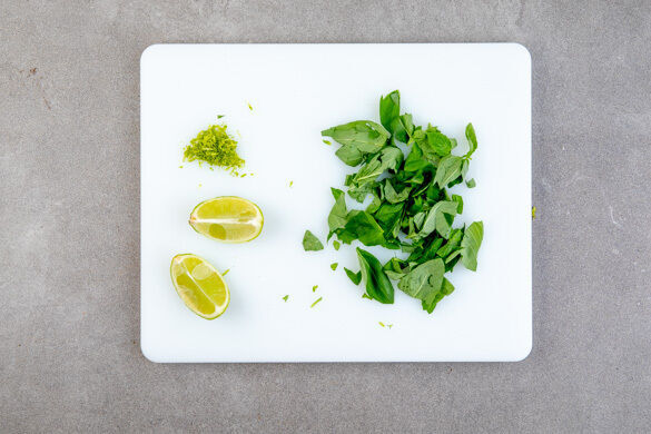 Inzwischen die Limettenschale abreiben und die Limette längs halbieren, eine Hälfte auspressen, die andere Hälfte in Spalten schneiden. Die Thai-Basilikumblätter von den Stängeln zupfen und grob schneiden.