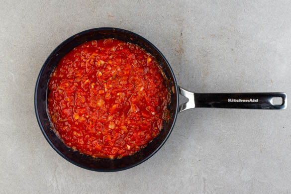 Die Zwiebeln und den Knoblauch in einer mittelgroßen Pfanne mit ½EL Olivenöl bei mittlerer bis starker Hitze ca. 2Min. anbraten. Die Tomaten zugeben und mit 1 Prise Zucker würzen, mit Salz und Pfeffer abschmecken. Die Hitze reduzieren und die Sauce köcheln lassen, bis die überschüssige Flüssigkeit verdampft ist.