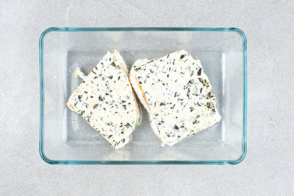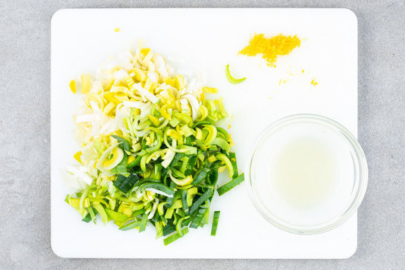 Den Backofen mit Grillfunktion oder Ober-/Unterhitze auf 250°C vorheizen. 2EL Butter aus dem Kühlschrank nehmen und beiseitestellen. In einem mittelgroßen Topf ausreichend gesalzenes Wasser für die Kartoffeln zum Kochen bringen. Den Lauch längs halbieren und in ca. 0,5cm dünne Streifen schneiden. Die Zitronenschale abreiben, dann die Zitrone halbieren und auspressen.