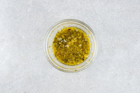 Die Kapern grob hacken und mit 4EL Olivenöl, 2–3EL Zitronensaft, 1EL Wasser, der Zitronenschale sowie je 1 Prise Salz, Pfeffer und Zucker zu einem Dressing verrühren.