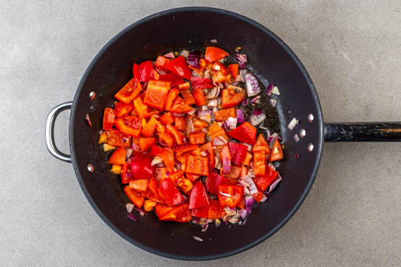 In einem kleinen Topf 300ml leicht gesalzenes Wasser für den Reis zum Kochen bringen. Die Paprika halbieren, entkernen und in grobe Würfel schneiden. Die Zwiebel schälen, halbieren und grob würfeln. Den Knoblauch schälen und in feine Scheibchen schneiden. Die Tomaten grob würfeln.