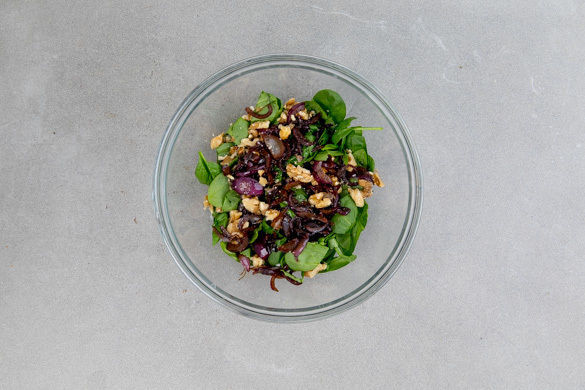 Die Walnüsse grob hacken und in einer kleinen Pfanne bei mittlerer Hitze ohne Zugabe von Fett 2–3Min. goldbraun anrösten. Vorsicht, die Nüsse können schnell verbrennen. Zum Abkühlen aus der Pfanne nehmen. Den restlichen Spinat grob hacken und mit den Walnüssen und den Zwiebeln vermengen. Mit Salz und Pfeffer abschmecken und den Strudel mit dem Salat servieren.